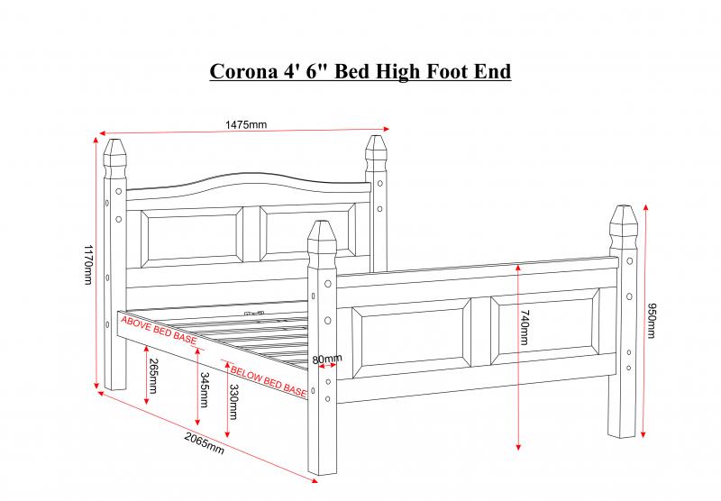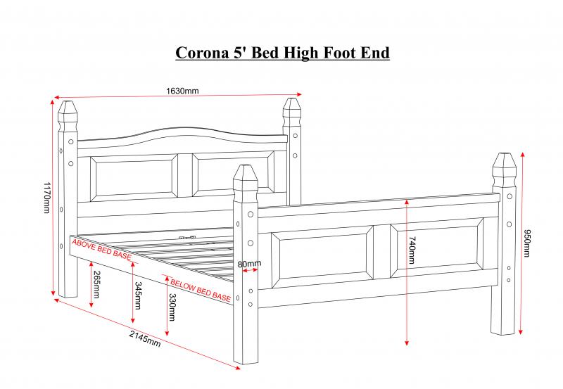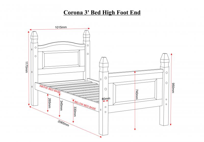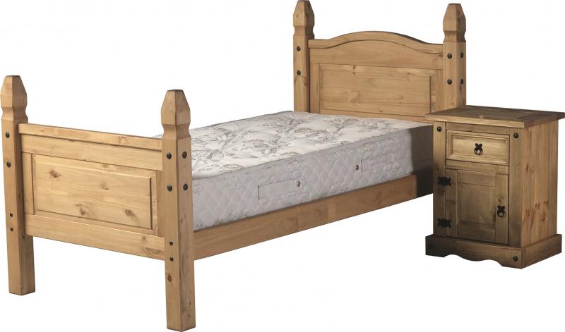 Made from solid pine, this Corona Pine is from the Corona Mexican Pine range is a must for a master bedroom or spare room. The frame is made with wooden panel slats that easily fit to the frame and it is built to last. Its panelled head board and foot board with small turreted posts and small decorative black metal studs will make a compact room stand out from the rest.