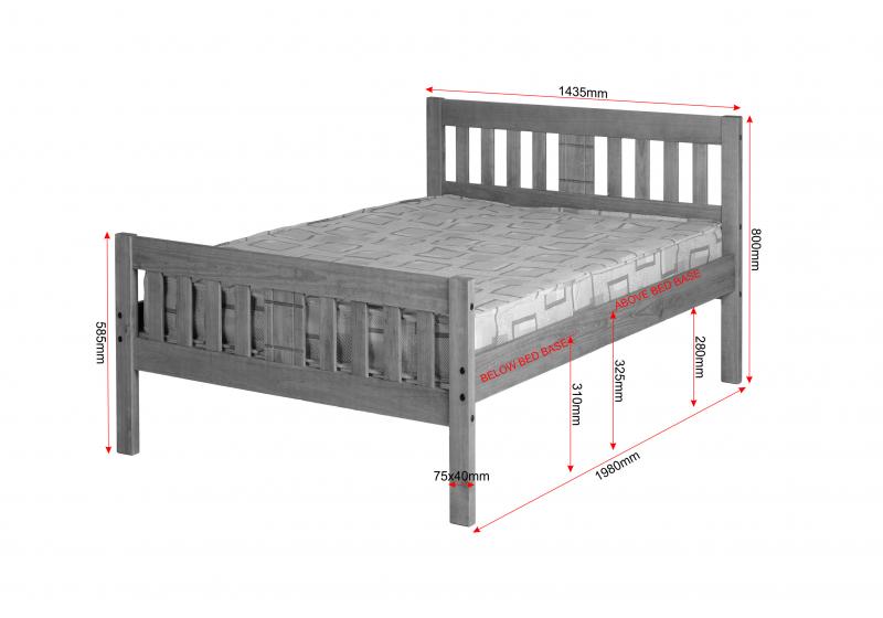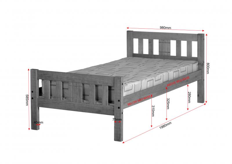 Extra Information: HEIGHT BELOW SIDERAIL 280MM – HEIGHT OF BED BASE 325MM – HEIGHT BELOW BED BASE 310MM – FOOTBOARD HEIGHT 585MM – HEADBOARD HEIGHT 800MM – POST THICKNESS 75MM X 40MM – SLAT QUANTITY X 12 – SLAT SIZE 65MM X 17MM – CENTRE SUPPORT LEG – MAX BED WEIGHT 200KG…. PINE