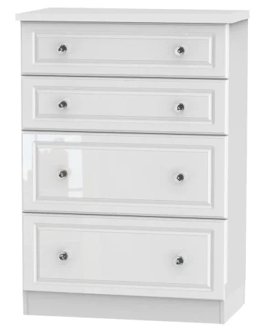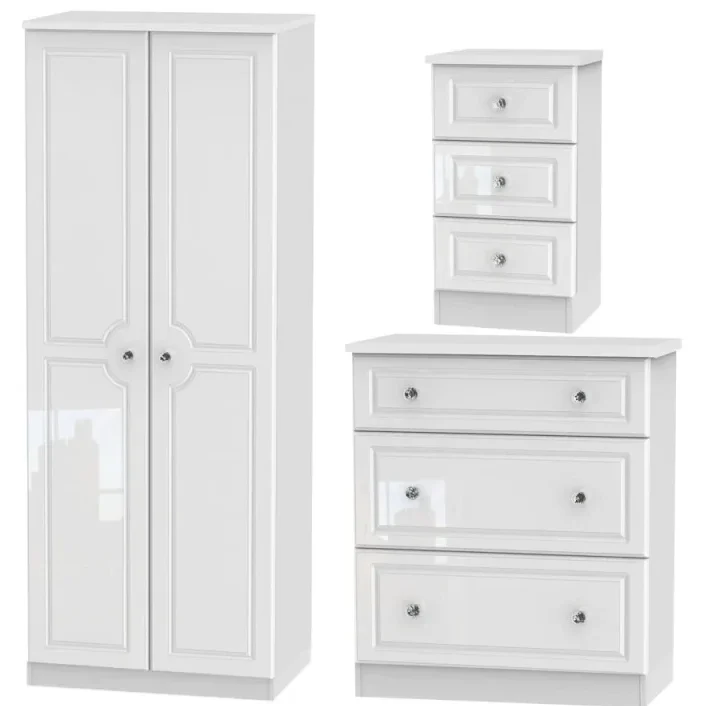 Specifications:  Made from a strong MDF, High Gloss Finish. Metal drawer runners, Crystal handles. Wardrobes come on castors as standard….